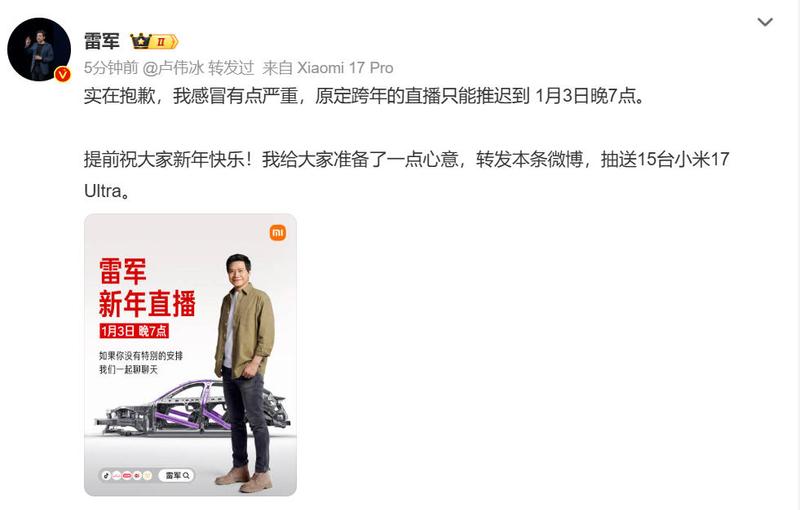 六合彩,六合彩开奖结果,六合彩预测,六合彩走势图,六合彩投注,六合彩技巧,六合彩结果今期,六合彩玩法易车讯 12月31日,小米创办人,董事长兼CEO雷军发文致歉:“我感冒有点严重,原定跨年的直播只能推迟到2026年1月3日晚7点。提前祝大家新年快乐!我给大家准备了一点心意,转发本条微博,抽送15台小米17 Ultra。
